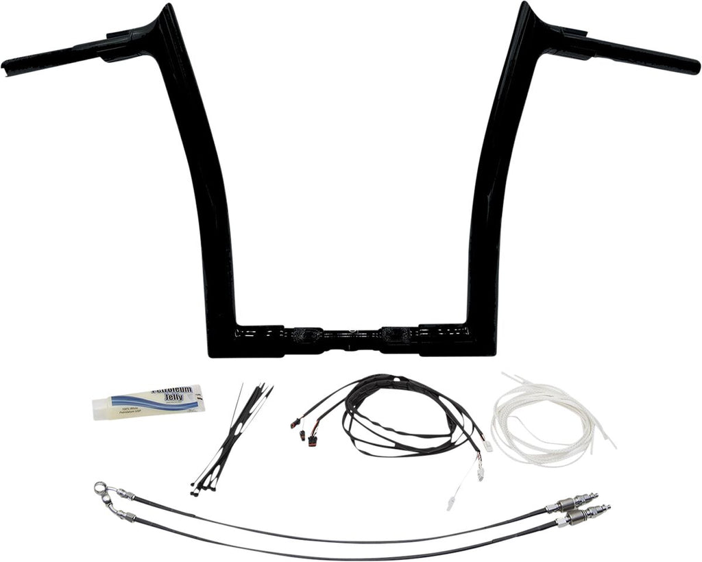 1-1/2" EZ Install Pointed Top Handlebar KitAdjustable 1-1/2” collar next to handlebar controls for custom look Revolutionary bolt-together two-piece handlebar design that takes up half the shelf space, is easy to ship and even faster to install CNC mandrel-bent from 1-1/2" diameter x .095" wall heavy tube EZ install means no more need to fight internal wiring; install handlebar wiring in minutes Billet machined top with a large internal machined radius allows for EZ pulling of wiring (non-welded top corner) Install kit includes everything needed to install the handlebars in half the time of other kits due to our design that only extends the existing clutch cable/ clutch line and brake lines Handlebars are knurled and notched for TBW applications Made in the USA Accepts OEM heated grips.