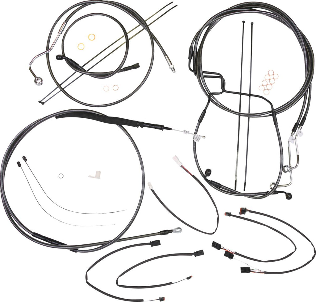 Black Pearl™ Designer Handlebar Installation KitThe only complete kit with matching braided cables and brake lines Kit includes throttle and idle cables of throttle-by-wire extensions, clutch cable or hydraulic clutch line, brake lines, copper crush washers, hardware, and any necessary switch wiring of turn signal extension All cables are a low-effort, high-efficiency design that meets or exceeds all OE specifications for fitment, construction, endurance Kit for dual disc models includes an all brazed manifold that eliminates leaks, alignment problems and unattractive threaded connections Assembled in the U.S.A. Kit is based on using ape hanger style handlebars with 2” risers. Harley Davidson FLHRXS 1868 ABS 2021-2024
