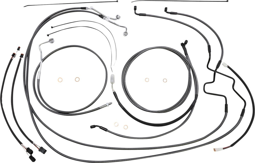 KARBONFIBR Designer Handlebar Installation KitKARBONFIBR wire braid is created from distinct black and gray tone wire colors which are blended and interwoven together to mimic the look of hi-tech carbon fiber. This unique alternative black braid highly complements black or blackout color scheme motorcycles Kit includes – Premium brake lines, clutch cable or hydraulic clutch line, throttle and idle cables or throttle-by-wire extensions, hardware, and fully terminated or plug-and-play switch and turn signal extensions Matching KARBONFIBR braided hydraulic lines and control cables provide a precise, OE fit KARBONFIBR high-efficiency cables feature anti-friction liners and inserts, durable clear coating, are factory lubricated for smooth, long-lasting operation, plus they meet or exceed OE specifications Clutch cables include a water-proof adjuster and a transmission fitting seal to eliminate oil leaks Premium KARBONFIBR brake lines incorporate PTFE tubing braided with DuPontTM Kevlar® Aramid Fiber reinforcement, Signature braid, and a clear PVC jacket Every Magnum brake line is pressure tested and fully FMVSS-106 compliant Harley Davidson FLTRK 1868 ABS 2020-2024 Harley Davidson FLTRKSE 1923 ABS 2022-2023 Harley Davidson FLTRU 1750 ABS 2017-2018 Harley Davidson FLTRU 1868 ABS 2019 Harley Davidson FLTRX 1750 2017-2018 Harley Davidson FLTRX 1750 2019 Harley Davidson FLTRX 1750 ABS 2017-2023 Harley Davidson FLTRXS 1750 ABS 2017-2018 Harley Davidson FLTRXS 1868 ABS 2019-2023 Harley Davidson FLTRXSE 1923 ABS 2018-2022 Harley Davidson FLTRXSE 1977 ABS 2023-2024
