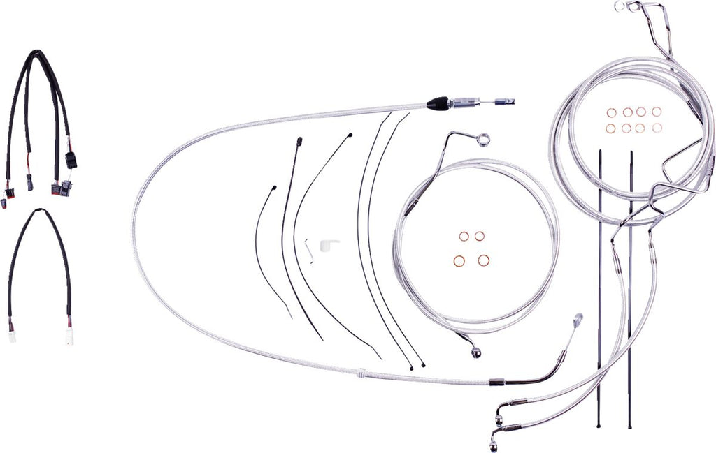 Sterling Chromite II® Designer Handlebar Installation KitComplete kit comes with matching braided cables and brake lines Kit includes throttle and idle cables of throttle-by-wire extensions, clutch cable or hydraulic clutch line, brake lines, copper crush washers, hardware, and any necessary switch wiring of turn signal extension All cable and brake lines feature Sterling Chromite II braid with highly polished chrome plated fittings All cables are a low-effort, high-efficiency design that meets or exceeds all OE specifications for fitment, construction and endurance Kits for dual disc models includes an all brazed manifold that eliminates leaks, alignment problems and unattractive threaded connections Assembled in the U.S.A. Kit is based on using ape hanger style handlebars with 2” risers. Harley Davidson FLH 1868 ABS 2021 Harley Davidson FLHT 1750 ABS 2021-2022 Harley Davidson FLHTK 1868 ABS 2021-2024 Harley Davidson FLHTKSE 1923 ABS 2021 Harley Davidson FLHX 1750 ABS 2021-2023 Harley Davidson FLHXS 1868 ABS 2021-2023 Harley Davidson FLHXSE 1923 ABS 2021-2022 Harley Davidson FLHXSE 1977 ABS 2023-2024 Harley Davidson FLHXST 1923 ABS 2022-2023
