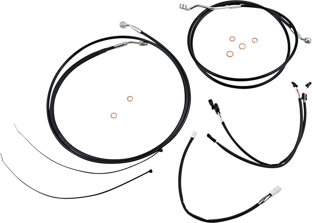 XR Handlebar Installation KitMagnum XR Handlebar Installation Kit offers a great fit and excellent quality at an economical price Kit features highly polished, chrome plated fittings All cables are a low effort, high efficiency design that meets or exceeds all OE specifications for fitment, construction, endurance Magnum XR Brake Lines use an enhanced construction of heavy gauge stainless steel embedded in tough abrasion resistant nylon outer jacket for superior durability and extreme braking response for safe riding The coating on cables and brake lines offers exceptional protection for paint or chrome Kits that include manifolds use an all brazed construction to ensure optimal OE fitment and appearance Manifolds use -3 AN connections for an easy installation Kit includes throttle and idle cables or throttle-by-wire extensions, clutch cable or XR hydraulic clutch line, XR brake lines, copper crush washers, hardware, turn signal and switch wiring extensions Kit is based on using ape hanger style handlebars and 2" risers. Harley Davidson FLRT 1868 ABS 2021-2024 Harley Davidson FLTRT 1868 ABS 2023-2024