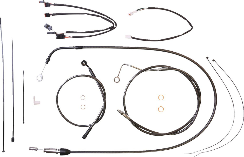 Black Pearl™ Designer Handlebar Installation KitThe only complete kit with matching braided cables and brake lines Kit includes throttle and idle cables of throttle-by-wire extensions, clutch cable or hydraulic clutch line, brake lines, copper crush washers, hardware, and any necessary switch wiring of turn signal extension All cables are a low-effort, high-efficiency design that meets or exceeds all OE specifications for fitment, construction, endurance Kit for dual disc models includes an all brazed manifold that eliminates leaks, alignment problems and unattractive threaded connections Assembled in the U.S.A. Kit is based on using ape hanger style handlebars with 2” risers. Harley Davidson FLH 1868 ABS 2021 Harley Davidson FLHT 1750 ABS 2021-2022 Harley Davidson FLHTK 1868 ABS 2021-2024 Harley Davidson FLHTKSE 1923 ABS 2021 Harley Davidson FLHX 1750 ABS 2021-2023 Harley Davidson FLHXS 1868 ABS 2021-2023 Harley Davidson FLHXSE 1923 ABS 2021-2022 Harley Davidson FLHXSE 1977 ABS 2023-2024 Harley Davidson FLHXST 1923 ABS 2022-2023