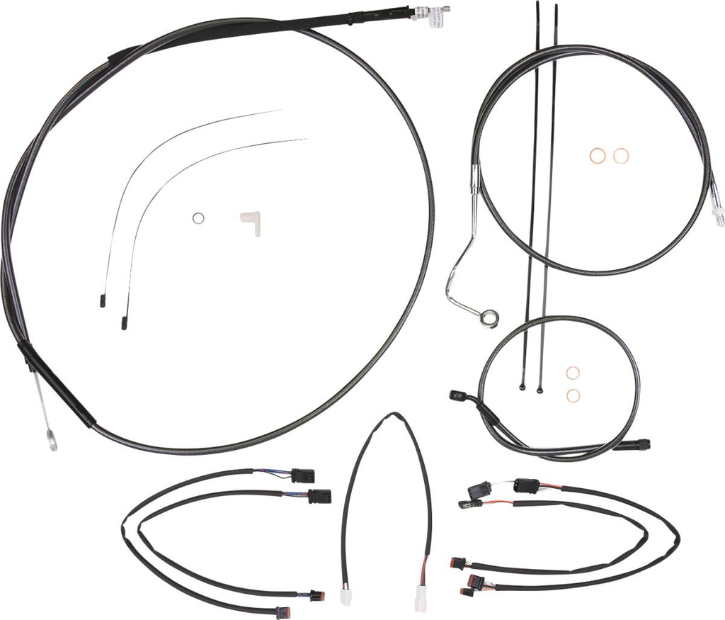 • Kit includes throttle and idle cables of throttle-by-wire extensions, clutch cable or hydraulic clutch line, brake lines, copper crush washers, hardware, and any necessary switch wiring of turn signal extension