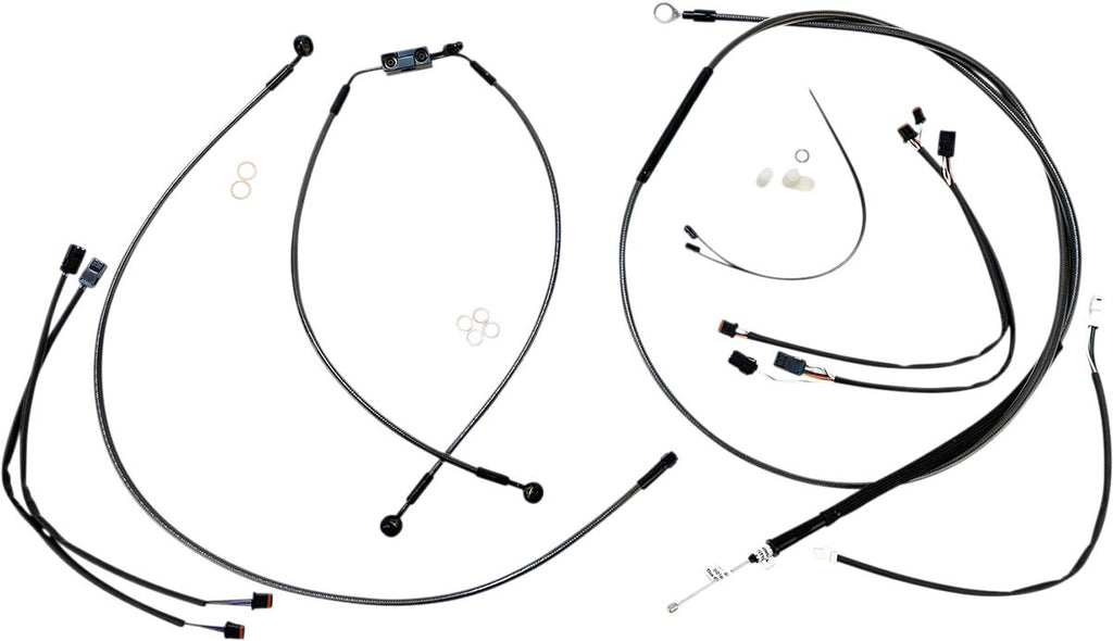 Black Pearl™ Designer Handlebar Installation KitThe only complete kit with matching braided cables and brake lines Kit includes throttle and idle cables of throttle-by-wire extensions, clutch cable or hydraulic clutch line, brake lines, copper crush washers, hardware, and any necessary switch wiring of turn signal extension All cables are a low-effort, high-efficiency design that meets or exceeds all OE specifications for fitment, construction, endurance Kit for dual disc models includes an all brazed manifold that eliminates leaks, alignment problems and unattractive threaded connections Assembled in the U.S.A. Kit is based on using ape hanger style handlebars with 2” risers. Harley Davidson FLTRK 1868 ABS 2024 Harley Davidson FXFB 1750 ABS 2018-2021 Harley Davidson FXFBS 1868 ABS 2018-2023 Harley Davidson FXLR 1750 ABS 2018-2020 Harley Davidson FXLRS 1868 ABS 2020-2021 Harley Davidson FXLRS 1923 ABS 2022-2024 Harley Davidson FXLRST 1923 ABS 2022-2024