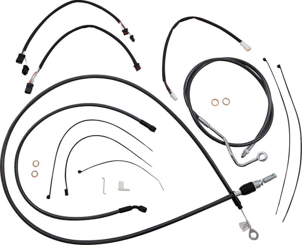 Black Pearl™ Designer Handlebar Installation KitThe only complete kit with matching braided cables and brake lines Kit includes throttle and idle cables of throttle-by-wire extensions, clutch cable or hydraulic clutch line, brake lines, copper crush washers, hardware, and any necessary switch wiring of turn signal extension All cables are a low-effort, high-efficiency design that meets or exceeds all OE specifications for fitment, construction, endurance Kit for dual disc models includes an all brazed manifold that eliminates leaks, alignment problems and unattractive threaded connections Assembled in the U.S.A. Kit is based on using ape hanger style handlebars with 2” risers. Harley Davidson FLHR 1750 ABS 2021-2022