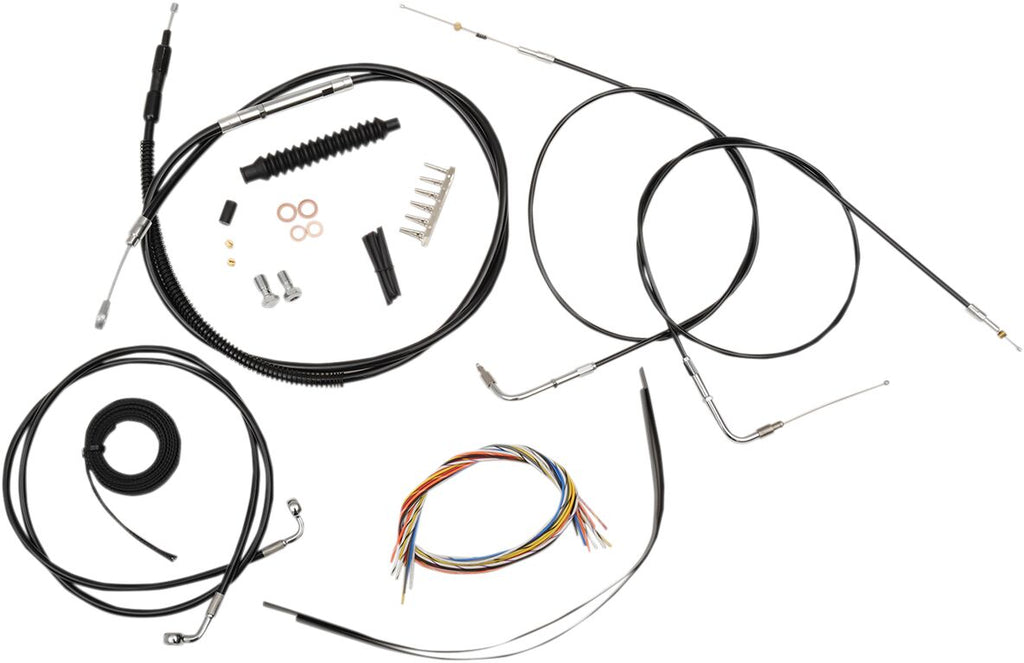 Complete Black Vinyl Braided Handlebar Cable/Brake Line KitComplete kit includes the correct length braided brake/clutch lines and wire extensions to complete a handlebar swap Chrome "T" brake line junction, banjo bolts, fittings and copper crush washers included Made in the U.S.A. Kit is based on using 2" risers with Ape Hanger handlebars. Harley Davidson FXDB 1584 2007-2011 Harley Davidson FXDC 1584 2007-2011
