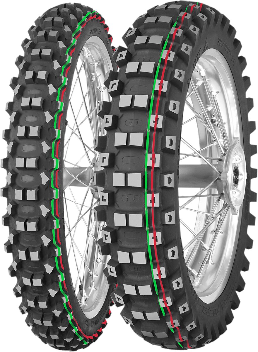 Terra Force-MX MH TireFor riders who train or compete on medium to hard surfaces and are looking for the best traction performance, control and braking capacity. The TERRA FORCE-MX MH features a specially designed tread pattern with a wide footprint that ensures optimal traction on hard surfaces while maintaining maximum durability for optimal acceleration, cornering and braking without loss of traction. The front tread pattern has been carefully designed to ensure maximum directional stability. The tyre can be recognised by its characteristic green and red stripes and is also available in Junior and Pitcross MX sizes. Not street legal as an NHS (Not for Highway Service). Gas Gas MC 50 2021-2023 Husqvarna TC 50 2017-2023 KTM SX 50 2006-2023 KTM SX 50 MINI 2008-2021