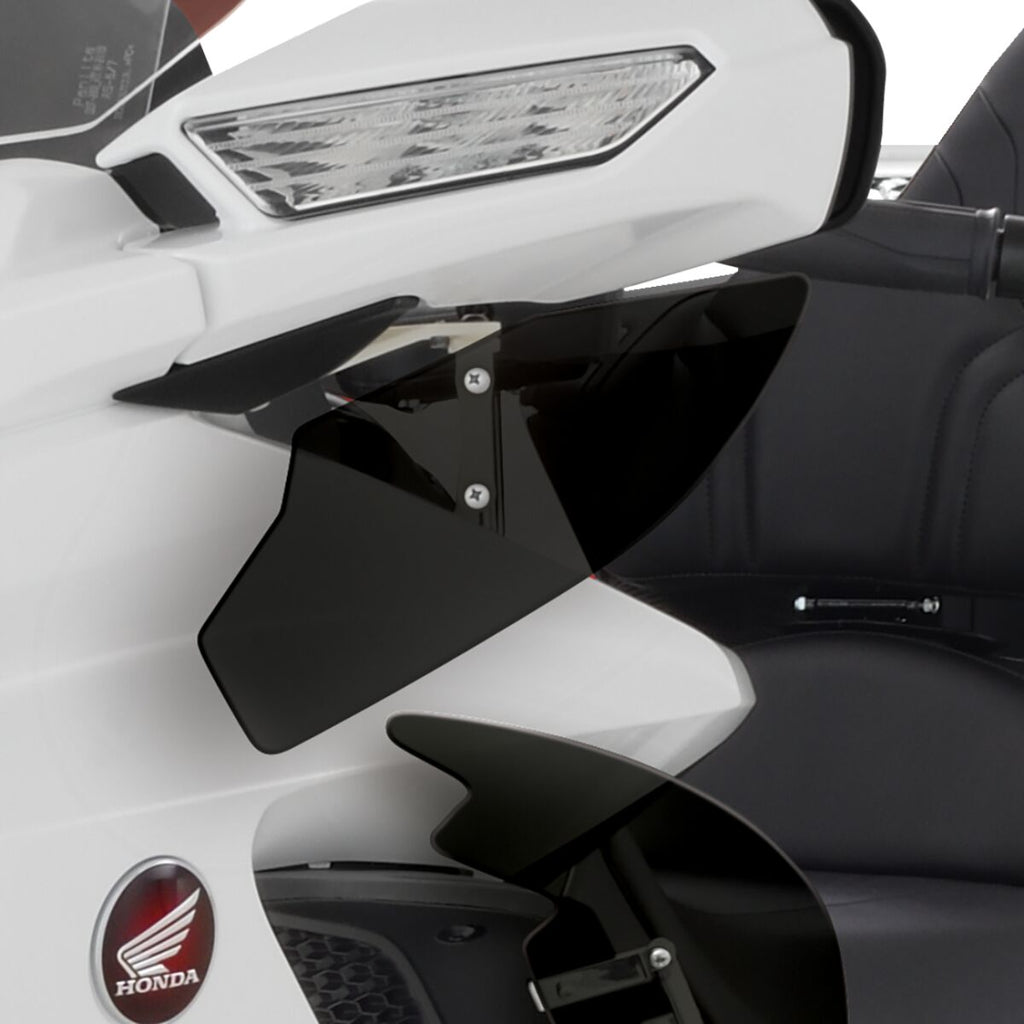 Upper Wind DeflectorsDeflect adverse weather conditions away from the rider, but also provides the flexibility to adjust the airflow for optimal comfort Designed to mount below the mirror using a customized pivot bracket Bracket allows for 125° rotation while ensuring the mirror can fold entirely without any interference from the wind deflector Easy to install with only 2 mounting holes per panel Honda GL 1800 ABS 2018-2023