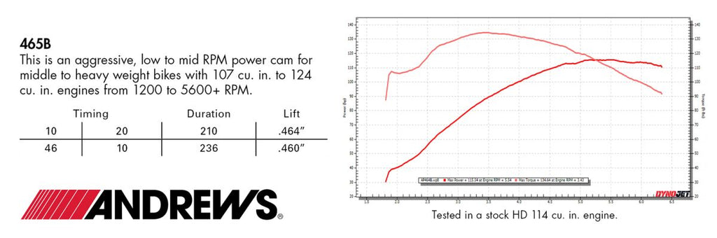 465B CamBolt-in chain drive cam for 107”-117” engines Use with stock valve springs For heavy and middle weight bikes Great low to mid rpm torque (1200-5600 rpm) Made in the USA Cam Specs are measured in the engine on the lifter @ 0.050" using a 1.61 rockearm ratio. Harley Davidson FLDE 1750 ABS 2018-2020 Harley Davidson FLFB 1750 ABS 2018-2020 Harley Davidson FLFBS 1868 ABS 2018-2024 Harley Davidson FLFBS 1923 ABS 2025-2026 Harley Davidson FLH 1868 ABS 2021 Harley Davidson FLHC 1750 ABS 2018-2022 Harley Davidson FLHCS 1868 ABS 2018-2024 Harley Davidson FLHCS 1923 ABS 2025-2026 Harley Davidson FLHR 1750 2017-2018 Harley Davidson FLHR 1750 2019 Harley Davidson FLHR 1750 ABS 2017-2022 Harley Davidson FLHRC 1750 ABS 2017-2019 Harley Davidson FLHRXS 1750 ABS 2017-2018 Harley Davidson FLHRXS 1868 ABS 2019-2024 Harley Davidson FLHT 1750 ABS 2019-2022 Harley Davidson FLHTCU 1750 ABS 2017-2019 Harley Davidson FLHTCUTG 1750 2017-2018 Harley Davidson FLHTCUTG 1750 ABS 2019 Harley Davidson FLHTCUTG 1868 ABS 2020-2024 Harley Davidson FLHTCUTGSE 1923 ABS 2020-2022 Harley Davidson FLHTK 1750 ABS 2017-2018 Harley Davidson FLHTK 1868 ABS 2019-2024 Harley Davidson FLHTKL 1750 ABS 2017-2018 Harley Davidson FLHTKL 1868 ABS 2019 Harley Davidson FLHTKSE 1868 ABS 2017 Harley Davidson FLHTKSE 1923 ABS 2018-2021 Harley Davidson FLHX 1750 2017-2018 Harley Davidson FLHX 1750 2019 Harley Davidson FLHX 1750 ABS 2017-2023 Harley Davidson FLHX 1923 ABS 2025-2026 Harley Davidson FLHXS 1750 ABS 2017-2018 Harley Davidson FLHXS 1868 ABS 2019-2023 Harley Davidson FLHXSE 1868 ABS 2017 Harley Davidson FLHXSE 1923 ABS 2018-2022 Harley Davidson FLHXST 1923 ABS 2022-2023 Harley Davidson FLRT 1750 2017-2018 Harley Davidson FLRT 1750 ABS 2019 Harley Davidson FLRT 1868 ABS 2020-2024 Harley Davidson FLSB 1750 ABS 2018-2024 Harley Davidson FLSL 1750 ABS 2018-2021 Harley Davidson FLSTFI 1923 ABS 2025-2026 Harley Davidson FLTRK 1868 ABS 2020-2024 Harley Davidson FLTRKSE 1923 ABS 2022-2023 Harley Davidson FLTRT 1868 ABS 2023-2024 Harley Davidson FLTRU 1750 ABS 2017-2018 Harley Davidson FLTRU 1868 ABS 2019 Harley Davidson FLTRX 1750 2017-2018 Harley Davidson FLTRX 1750 2019 Harley Davidson FLTRX 1750 ABS 2017-2023 Harley Davidson FLTRX 1923 ABS 2025-2026 Harley Davidson FLTRXS 1750 ABS 2017-2018 Harley Davidson FLTRXS 1868 ABS 2019-2023 Harley Davidson FLTRXSE 1923 ABS 2018-2022 Harley Davidson FLTRXST 1923 ABS 2022-2023 Harley Davidson FXBB 1750 ABS 2018-2020 Harley Davidson FXBB 1923 ABS 2025-2026 Harley Davidson FXBBS 1868 2021 Harley Davidson FXBBS 1868 ABS 2021-2024 Harley Davidson FXBR 1750 ABS 2018-2020 Harley Davidson FXBR 1923 ABS 2023-2026 Harley Davidson FXBRS 1868 ABS 2018-2022 Harley Davidson FXDR 1868 ABS 2019 Harley Davidson FXDRS 1868 ABS 2020 Harley Davidson FXFB 1750 ABS 2018-2021 Harley Davidson FXFBS 1868 ABS 2018-2023 Harley Davidson FXLR 1750 ABS 2018-2020 Harley Davidson FXLRS 1868 ABS 2020-2021 Harley Davidson FXLRS 1923 ABS 2022-2026 Harley Davidson FXLRST 1923 ABS 2022-2026 Harley Davidson FXST 1750 2021 Harley Davidson FXST 1750 ABS 2020-2024