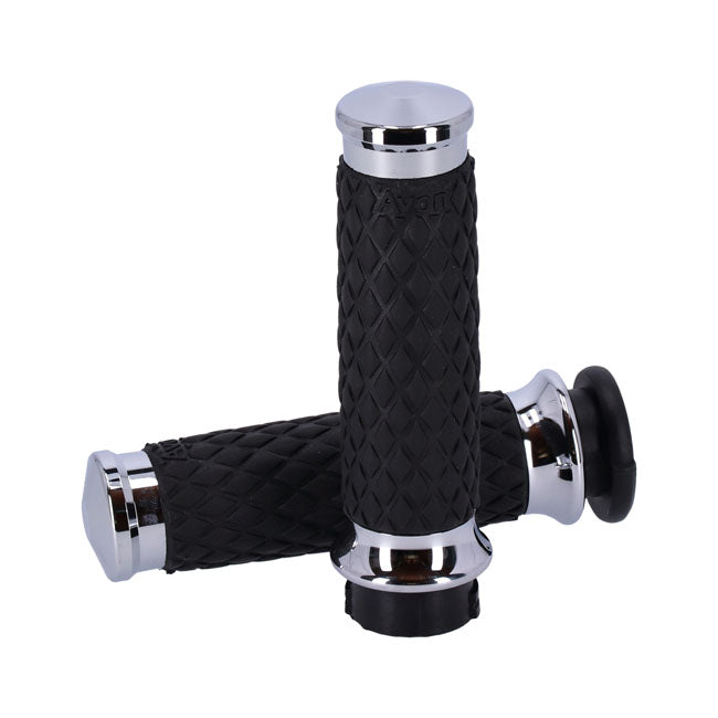 Chrome plated end caps and collars. For 1" diameter handlebars. Length 11.7cm. Includes throttle sleeve. Similar to the Avon air cushioned grips, the Air-SS incorporates a system of air pockets inside the grip to dampen vibration, but Air-SS grip does not have any surface bumps but a consistent surface diameter. Complete with an grip-enhancing knurled 'Diamond' texture with 6061 billet aluminum end caps and collars. Fitment: 96-22 H-D with dual throttle cables (excl. Street) (NU)