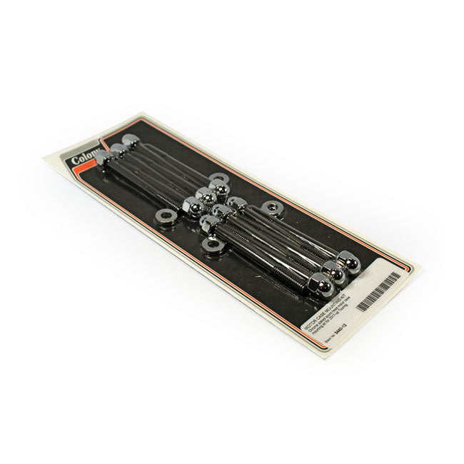 Chrome plated. Acorn nuts with studs. Includes all hardware to bolt engine case halves together.