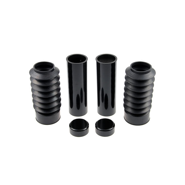 Gloss black powder coated CNC machined aluminum covers. Covers the full front fork from bottom to top of the upper triple tree. Includes aluminum fork tube caps, upper fork covers and genuine black rubber (bobber boots) lower fork covers for a touch of retro. Transforms the complete front end to a massive Black-Out muscle bike look. Compatible with stock and custom fenders. Installs with set-screws. All required hardware is included.