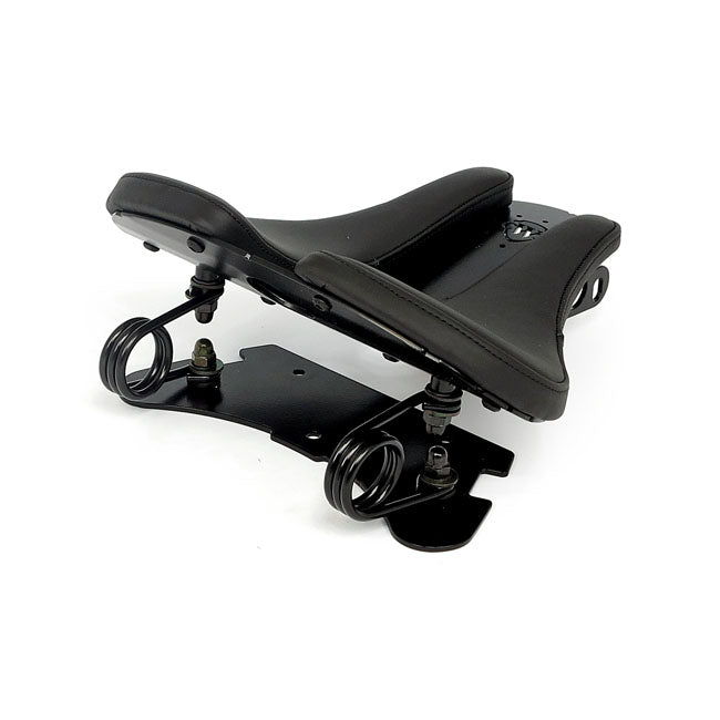 With one-piece seat. Gloss black powder coated steel construction. Includes the frame mount plate, early scissor style seat springs and a seat with a 2-piece genuine leather upholstery. The steam-punk orientated styling gives it the right retro touch and is guaranteed to lift your bike to new custom levels. Note: Great style-combo with the Cult-Werk swingarm mounted fenders. Note: For the optional Cult-Werk ABS frame cover see 963105 (short) or 963104 (long, up to the shocks).