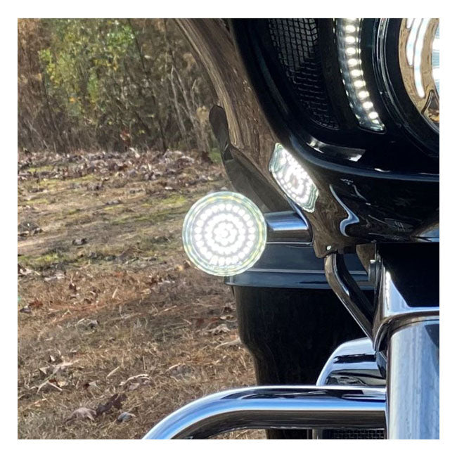 Smoke lens. Amber & white LEDs. Custom Dynamics® Genesis® Dynamic Ringz®. For Front use with dual filament 1157 lamp base. Fits turn signals that are equipped with a dual filament (1157 lamp base). Will not fit EU models unless custom converted to a 1157 dual filament lamp base. Comes with a total of 48 super bright dual color amber and 6000K white daylight driving LEDs on a Black circuit board. When the turn signal is activated the white LEDs turn off for better visibility of the amber turn signal. DOT and SAE compliant. Installation and wiring instructions included. Note: Will not fit EU models and any CVO™ models.
