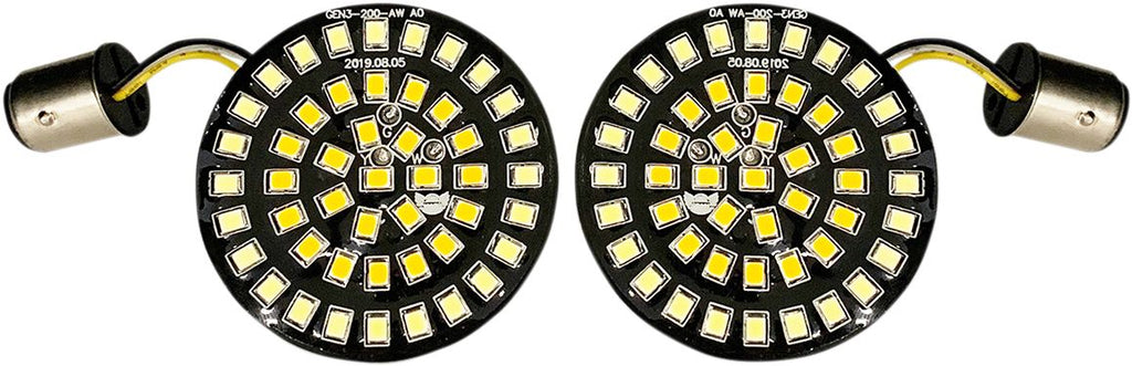 Front Dual Ring Turn Signal Inserts2” diameter GEN 300 Series LED clusters which are brighter than the original versions Features an outer ring of 24 white LEDs for a bright cool-white driving light Inner ring has 24 amber LEDs for an exceptionally bright amber turn signal When a turn signal is activated the white LEDs turn off for the entire turn signal cycle, providing greater visibility to the amber turn signal Must be used with a clear or smoked lens (sold separately) BCM and DOT compliant A load equalizer may be needed Harley Davidson FLSTC 1340 1997