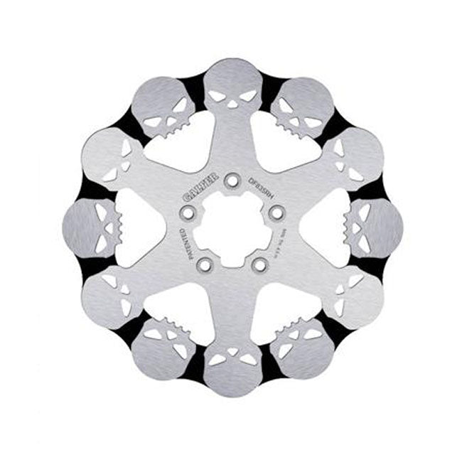Galfer Brake Rotor Wave Skull Design Fixed 300X5Mm For Front: 15-24 Softail 300mm (11.8") OD, 5mm thick, 56.3mm ID, 8mm (5/16") counterbored mount holes, 3.25" BCD. Mount style B. Fits OEM or accessory cast & laced wheels with 3.25" bolt circle mount holes. Replacement reference 41500022 (left only) & 41500068 (right only), 41500172. Note: All Galfer brake rotor designs are symmetrical. This allows left or right side installation without optical issues. Galfer Skull discs are of original design and feature custom skull motifs. They are designed for those who want to take the aesthetics of their customized motorcycle to the most extreme level. Available in a floating version, like their other variants, they come with an anti-corrosion treatment and are made of stainless steel (AISI 420). Front: 15-24 Softail (Excl. FXSE) / 06-17 Dyna (Excl. 2017 FXDLS) / 08-24 FLT/Touring (Excl. 2024 FLHX, FLTRX 117" / 23-24 FLHXSE, FLTRXSE 121" VVT / 2024 FLTRXSTSE 121" HO / 09-24 Trikes) / 14-22 XL Sportster. (Models with 3.25" bolt circle mount holes only)