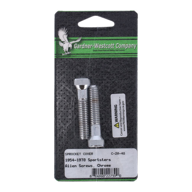 Gardner-Westcott Sprocket Cover Mount Kit Chrome Allen Head 911859 Custom chrome plated Allen head style mounting hardware. Fits transmission sprocket cover on right side of engine. 54-56 K, KH model / 57-70 XL Sportster (NU)