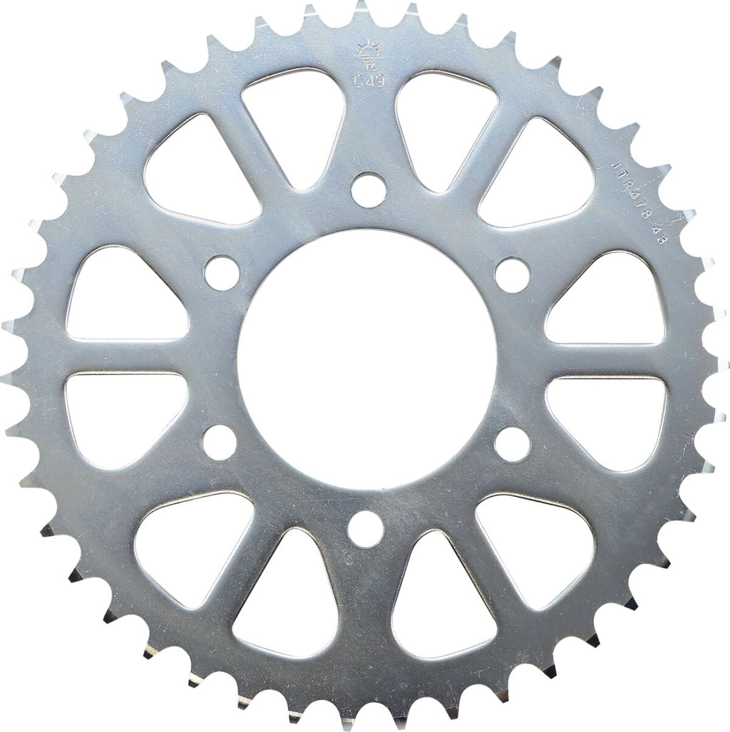 Steel Rear SprocketComputer-designed to achieve ultimate strength at minimum weight JT combines leading-edge technology with top materials to produce the ultimate quality sprocket range with unbeatable value Every sprocket meets or exceeds the highest possible quality standards for the motorcycle industry Sprockets are heat-treated and bead blasted to reduce material surface tension Made with top-quality-grade C45 high-carbon steel Kawasaki Z 550 GP 1981-1983 Kawasaki KZ 550 1983-1984 Kawasaki KXT 250 1984-1985 Kawasaki ZXR 400 1989-1999 Kawasaki ZXR 400 R SP 1989-1990 Kawasaki ZX-7 RR 1996-1999 Kawasaki ZX-6 R 600 1998-2016 Kawasaki ZX-6 R 636 2002-2019 Kawasaki ZX-6 RR 600 2003-2006 Kawasaki Z 750 2004-2012 Kawasaki ZX-10 R 1000 2004-2019 Kawasaki Z 750 S 2005-2006 Kawasaki ER-6F 650 2006-2016 Kawasaki ER-6F 650 ABS 2006-2016 Kawasaki ER-6N 650 2006-2016 Kawasaki ER-6N 650 ABS 2006-2016 Kawasaki EX 650 R 2006-2011 Kawasaki KLE 650 2007-2015 Kawasaki KLE 650 ABS 2007-2024 Kawasaki Z 750 ABS 2007-2012 Kawasaki ZX-10 R 1000 ABS 2011-2025 Kawasaki EX 650 2012-2015 Kawasaki EX 650 ABS 2012-2016 Kawasaki Z 750 R 2012 Kawasaki Z 750 R ABS 2012 Kawasaki Z 800 2013-2016 Kawasaki Z 800 ABS 2013-2016 Kawasaki ZX 1000 2013 Kawasaki ZX 1000 ABS 2013-2017 Kawasaki ZX-6 R 636 ABS 2013-2025 Kawasaki EN 650 2015-2020 Kawasaki EN 650 ABS 2015-2025 Kawasaki NINJA 650 2017-2019 Kawasaki NINJA 650 ABS 2017-2025 Kawasaki Z 650 ABS 2017-2025 Kawasaki ZX-10 RR 1000 ABS 2017-2025 Kawasaki Z 650 2018-2019 Kawasaki ZX-10 R 1000 SE ABS 2018-2020 CF Moto GT 400 ABS 2020-2021 CF Moto GT 650 ABS 2020-2023 CF Moto MT 650 ABS 2020-2023 CF Moto NK 400 ABS 2022-2023 CF Moto NK 650 ABS 2022-2023 Kawasaki Z 650 RS ABS 2022-2024 CF Moto MT 700 ABS 2023 Kawasaki ELIMINATOR 500 ABS 2024-2025 Kawasaki ELIMINATOR 500 SE ABS 2024 Kawasaki NINJA 500 ABS 2024-2025 Kawasaki NINJA 500 SE ABS 2024-2025 Kawasaki Z 500 ABS 2024-2025 Kawasaki Z 500 SE ABS 2024-2025
