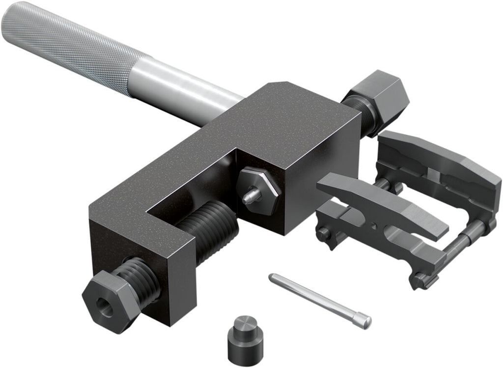 Kellermann Chain Tool Chain breaking and riveting tool allows an easy removal of the worn chain and a precise assembly of the new chain with hollow rivets, so that the swingarm can stay installed Designed for chains of all brands (such as DID, Regina, RK etc.) Only a 19 mm ring or socket wrench is required for use Chain tool contains a patented, magnetic positioning tool for the assembly of the connecting link, which ensures simple and absolutely precise mounting of the side plate of the connecting link Positioning unit consists of two magnetic plates that are coupled together via a guide for precise and comfortable positioning of the connecting link parts Plates stick magnetically to the connecting link, for hands free to work By using the rivet head extension set, PART #3806-0028, this tool is suitable for full rivet locks Tool is designed for chain sizes: 520, 525, 530, 532, 630, 632. With the included adapter it’s also usable for chain sizes: 415, 420, 428 Made in Germany