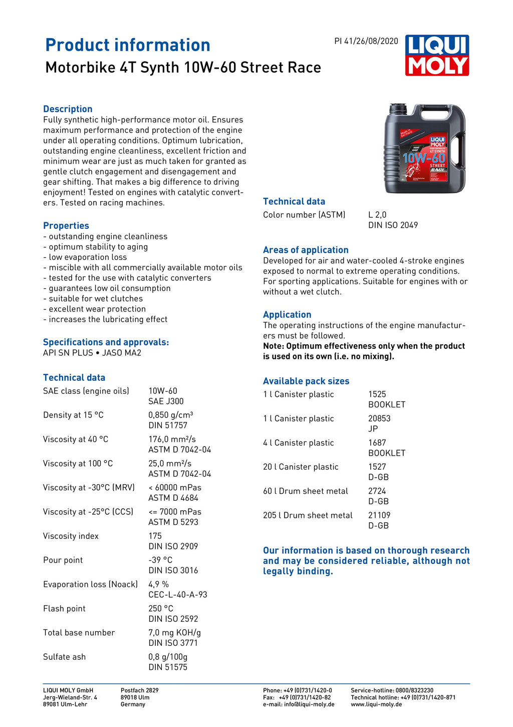 Fully synthetic high-performance motor oil. Ensures maximum performance and protection of the engine under all operating conditions. Optimum lubrication, outstanding engine cleanliness, excellent friction and minimum wear are just as much taken for granted as gentle clutch engagement and disengagement and gear shifting. That makes a big difference to driving enjoyment! Tested on engines with catalytic converters. Tested on racing machines.
