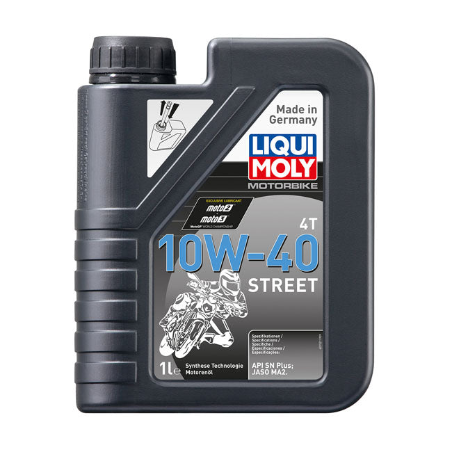 Liqui Moly 4T 10W-40 Street Oil 1 Liter Language label GB-F-ALGERIEN-ARAB. Semi-synthetic motor oil (mineral oil blended with full synthetic oil) for a cost-effective maximum quality. Quality motorcycle oil developed for air- and water-cooled 4-stroke engines, which work on normal to heavy duty conditions. Suitable for a sportive riding style. Compatible with dry and wet clutches. Okay for catalysts. - Performance level: API SN PLUS, JASO MA2 - keeps engine clean - excellent shear stability - low oil consumption - excellent for wet clutches - high wear protection - catalytic converters tested - optimal aging stability - optimal lubrication under all conditions
