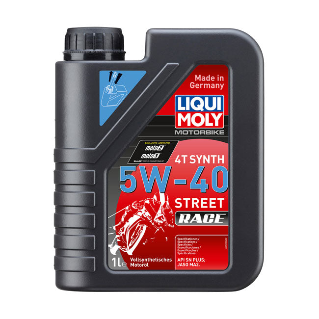Liqui Moly 4T Synthetic 5W-40 Street Race Motor Oil 1L Language label D-booklet. Full-synthetic engine oil of supreme quality. As the official motor oil of the Moto2 and Moto3 series, this is the perfect motor oil to protect high performance or race engines in extreme conditions. Lubricates and protects the engine, optimizes the power output, minimizes wear and helps prevent deposits. This oil has proven itself under race conditions and transports the experience and excellence from the racetrack directly to the road. Okay for bikes with catalytic converters. - Performance level: API SN PLUS, JASO MA2 - tested for the use with catalytic converters - optimal aging stability - outstanding engine cleanliness - low oil consumption - optimum lubrication under most extreme operating conditions - excellent shear stability - perfect for wet clutches - excellent wear resistance
