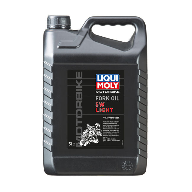 Liqui Moly Fork Oil 5W Light 5 Liter Full synthetic damping fluid for telescopic forks and shock absorbers. Prevents the formation of foam and the hardening of seals. Offers good corrosion and wear protection for long and reliable damping. Note: Language label in D-GB-I-E-P. Note: Also suitable for fork oil requirement SAE 4W through SAE 2.5W. Note: It is advised to follow the instructions of the suspension manufacturer in regards to viscosity and fluid volume requirements. - Exceptionally sensible responsiveness - Lasting corrosion protection - Anti-foam dopes - Increased riding safety - High wear resistance - Prevents oil seals from swelling