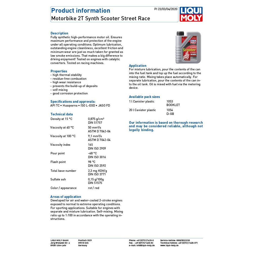 Fully synthetic high-performance motor oil. Ensures maximum performance and protection of the engine under all operating conditions. Optimum lubrication, outstanding engine cleanliness, excellent friction and minimum wear are just as much taken for granted as low smoke emissions. That makes a big difference to driving enjoyment! Tested on engines with catalytic converters. Tested on racing machines.