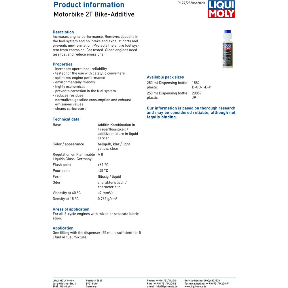 Increases engine performance. Removes deposits in the fuel system and on intake and exhaust ports and prevents new formation.Protects the entire fuel system from corrosion.Cat tested.Clean engines need less fuel and reduce emissions.Areas of application For all 2-cycle engines with mixed or separate lubrication.