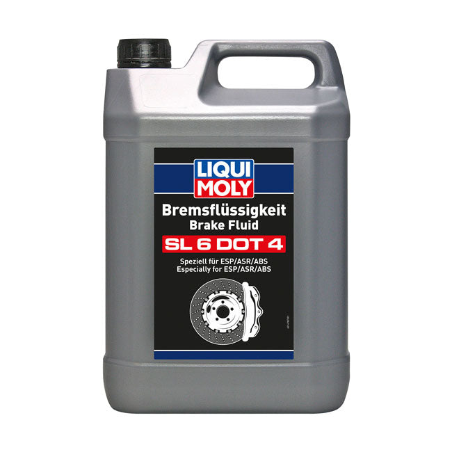 Liqui Moly Sl6 Dot 4 Brake Fluid 5 Liter Language label D-GB. Synthetic brake fluid based on glycol ethers and their boric acid esters. Contains effective corrosion inhibitors and antioxidant additives. Specially developed to extend the operating life of components in the hydraulic brake and clutch systems. High boiling point and wet boiling point, thus ensuring safe braking even after the absorption of some moisture over an extended period of use. Special moisture scavengers help prevent the formation of steam bubbles. Well-suited for use with hydraulic brake and clutch systems in vehicles for which a synthetic brake fluid is prescribed. With its low low temperature viscosity, this brake fluid is especially suitable for brake systems equipped with modern safety systems such as ESP/DSC, ABS and/or ASR / TCS. Specifications & approvals: FMVSS 116 DOT 3 • FMVSS 116 DOT 4 • ISO 4925 Class 6 • SAE J 1703 • SAE J 1704. Note: Brake fluid is hygroscopic (attracts water) and must be kept in sealed containers. - Excellent viscosity/temperature properties - High thermal stability - Assures a high degree of lubricating action on all moving components in the hydraulic brake circuit - Outstanding protection against the formation of steam bubbles - Excellent elastomer compatibility - Excellent low temperature behavior - ESP/DSC, ABS and/or ASR / TCS compatible - Can be mixed with other synthetic brake fluids - High wet and dry boiling points - ERBP ≥ 260 °C - ERBP, wet ≥ 165 °C