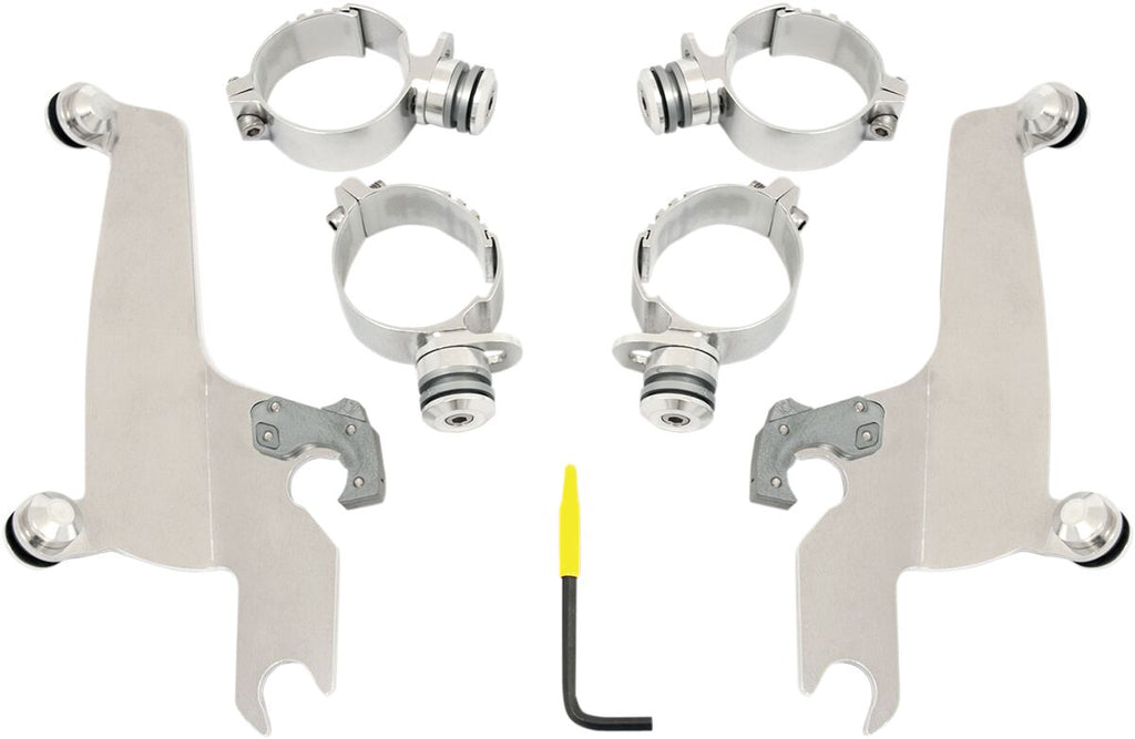 No-Tool Trigger-Lock Mount Kit for SportshieldThe revolutionary No-Tool Trigger-Lock mounting kits feature a detach system that allows you to quickly and easily remove or swap out your Sportshield without the use of any tools A pair of latches lock the windshield down until the spring loaded "trigger locks" are intentionally disengaged, allowing the rider to remove the windshield Kits are a combination of CNC-machined aluminum plates and anchors, stainless steel hardware, gray polymer bushings and glass-filled nylon latches or "Night Shades" black version which, is a gradient black windshield with black E-coated stainless steel straps, fittings and hardware for a black-on-black sinister look Kits are custom-fit to each style of bike for no-hassle installation Suzuki M 50 2005-2009 Suzuki M 50 Z 2009 Suzuki VZ 800 2005-2009