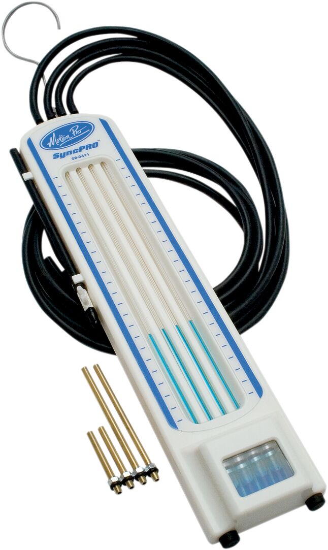 SyncPro™ Carburetor TunerPrecise four-channel vacuum indicator designed specifically for intake synchronization of engines with multiple carburetors or throttle bodies Includes manometer fluid, hoses, 5 mm adapters, in-line restrictors and instructions Spill-proof design means the tool can be stored in a horizontal or vertical position For use with any two-, three- or four-cylinder 4-stroke engines 5 mm adapters are used on many Honda and Suzuki models Includes hang hook to clip onto the handlebars for easy use Most Kawasaki models do not need adapters Unaffected by barometric pressure changes Mercury-free design