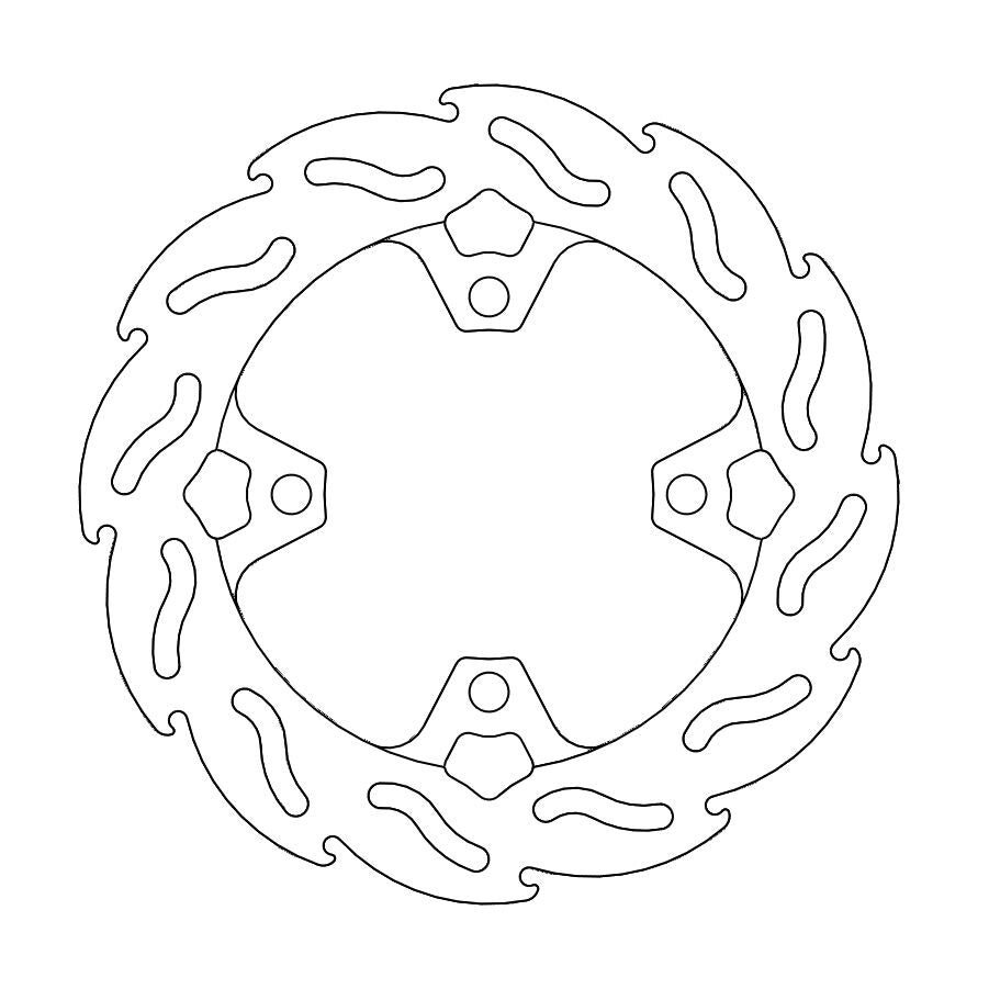 • Flame shaped venting slots and outer perimeter ensure an equal amount of contact surface between the brake pad and disc throughout the whole rotation of the disc.