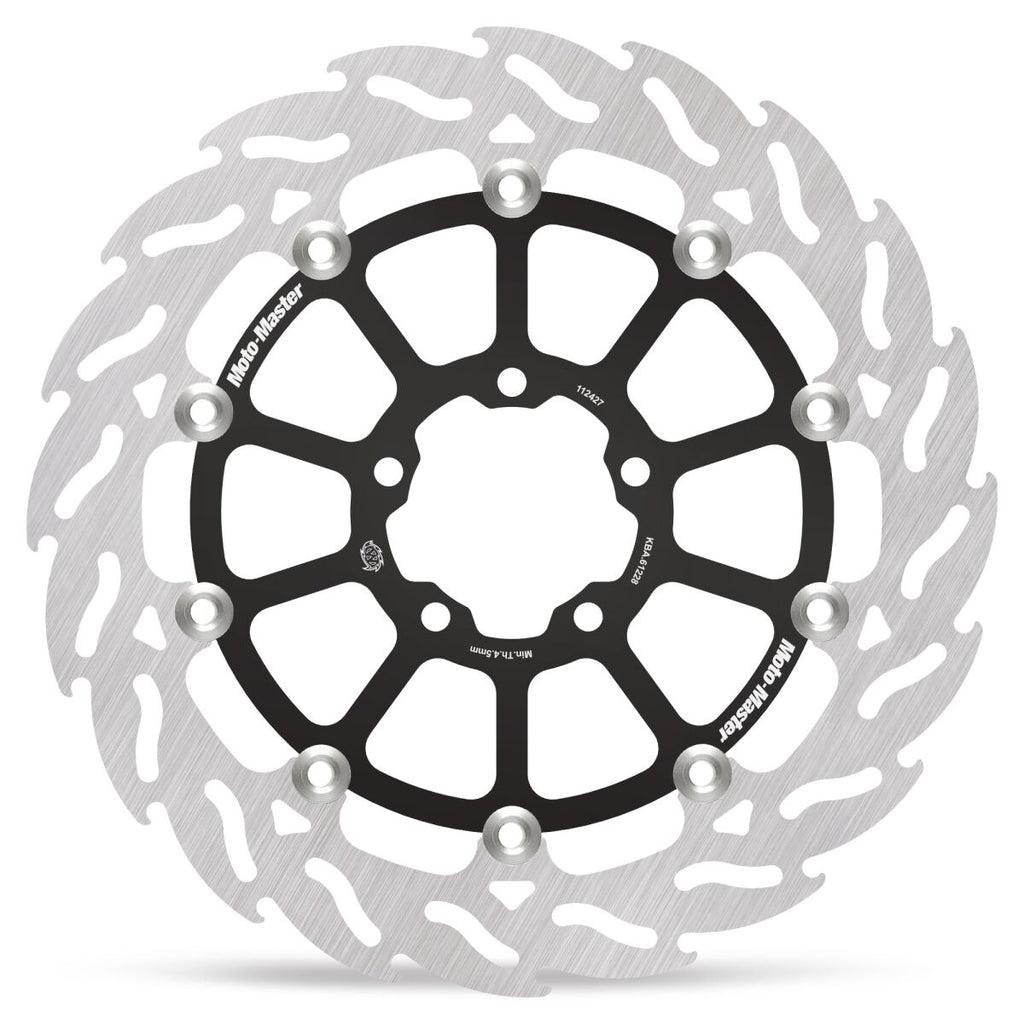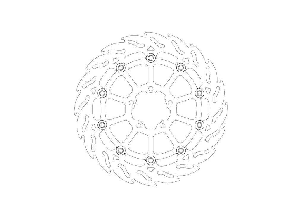 Flame Series RotorBolt-on performance upgrade Flame design ensures optimal heat dissipation and a perfect cleaning of the brake pad surface Durable, premium quality stainless steel outer ring, mounted with lightweight stainless floaters Precision double-ground for excellent rider feedback, eliminating any pulsation at the lever Equal brake pad contact throughout entire rotation of disc ensures linear braking action CNC-machined 6082 billet aluminum, black anodized carrier is lightweight and strong Can be used with any type of brake pad Also available in a 5,5 mm professional racing version Brake Rotor Floating Flame Front, KTMKTM DUKE 990 ABS 2024