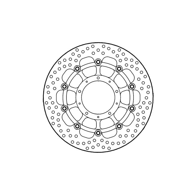 The Moto-Master HALO brake disc has a premium quality stainless steel outer ring allows for high performance braking while at the same time extremely durable. - Exact size and positioning of the venting holes ensures equal heat dispersion under high thermal stress while the brake pad contact surface is cleaned evenly. - The laser cut and precision grinded outer ring is fixed to a billet CNC machined aircraft aluminium carrier which is black anodized and laser marked. - Lightweight stainless steel floaters. - TUV approved.