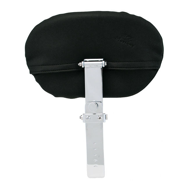 Black. Smooth. Pad dimension approx. 12" wide and 7" high. Features a classic pillow seat upholstery, hand-tied buttons and extra padding for the true upholstered pillow top look. Fits all 2-up Mustang seats equipped with a built-in receiver for a rider backrest. Comes as backrest with post only, the receiver is not included but must be present in the seat. The backrest is fully back/front/up/down adjustable and will pivot to your back angle. Installs and removes easily and without tools. Will fold flat for best storage. Note: Will not fit solo seats or the H-D® Tallboy® seat.