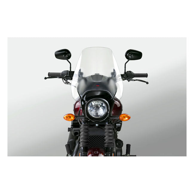 ABE and DOT approved. The Deflector screen™ was an acrylic screen but now upgraded to hard coated Lexan® polycarbonate for optimum impact protection and scratch resistance. The innovative 'rake adjustment' mount system allows a 100° angle adjustment. Fits most models, including Springers. Mounts to the handlebar with included clamps. Mounting hardware and instruction included. Quantum® hardcoated Lexan polycarbonate 3mm thick. Incl mount kit: both 7/8" and 1" U-clamp sets. Headlight Cutout to Top of Screen: 14.00" (35.5cm) / Width: 15.00" (38.1cm).
