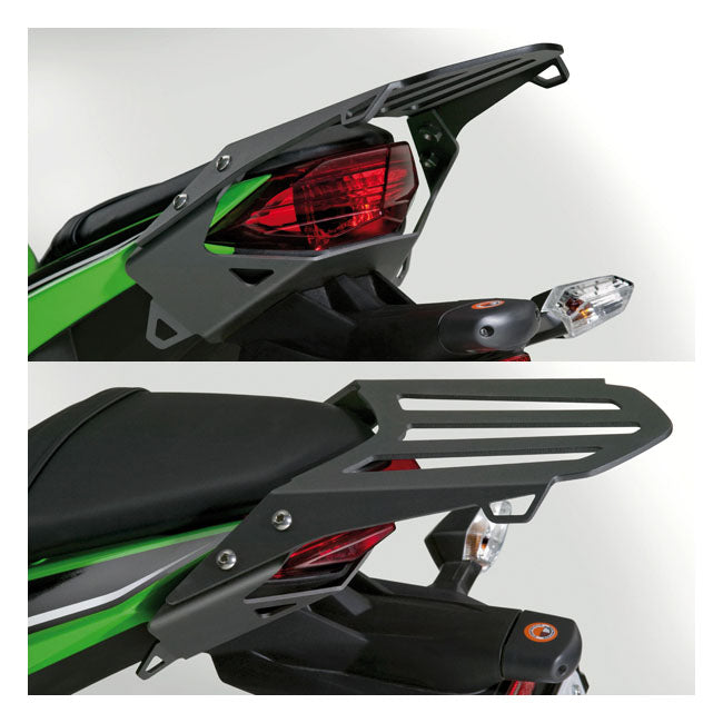 Luggage Rack designed specially for the EX300 Ninja™ to greatly improve the carrying capacity. The roomy rack surface with three bungee attachment points on each side allows riders to carry a decent sized duffel bag. The rack is made from precision, laser-cut aluminum, and the mounting bracket is made from precision cut and formed steel. Both integrate seamlessly with the lines and style of the EX300 Length: 8.25" (21.0cm) Width: 6.75" (17.1cm)