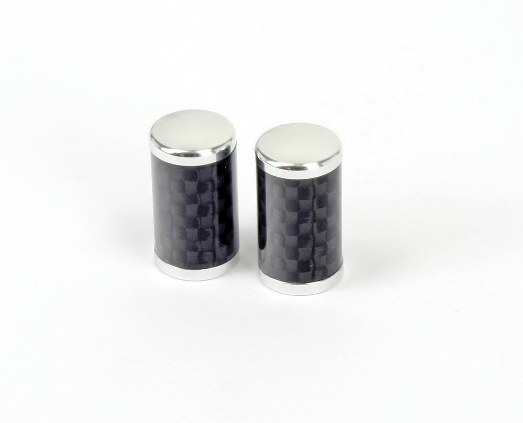 Premium quality valve cap, features chrome effect ends with a real carbon fibre sleeve