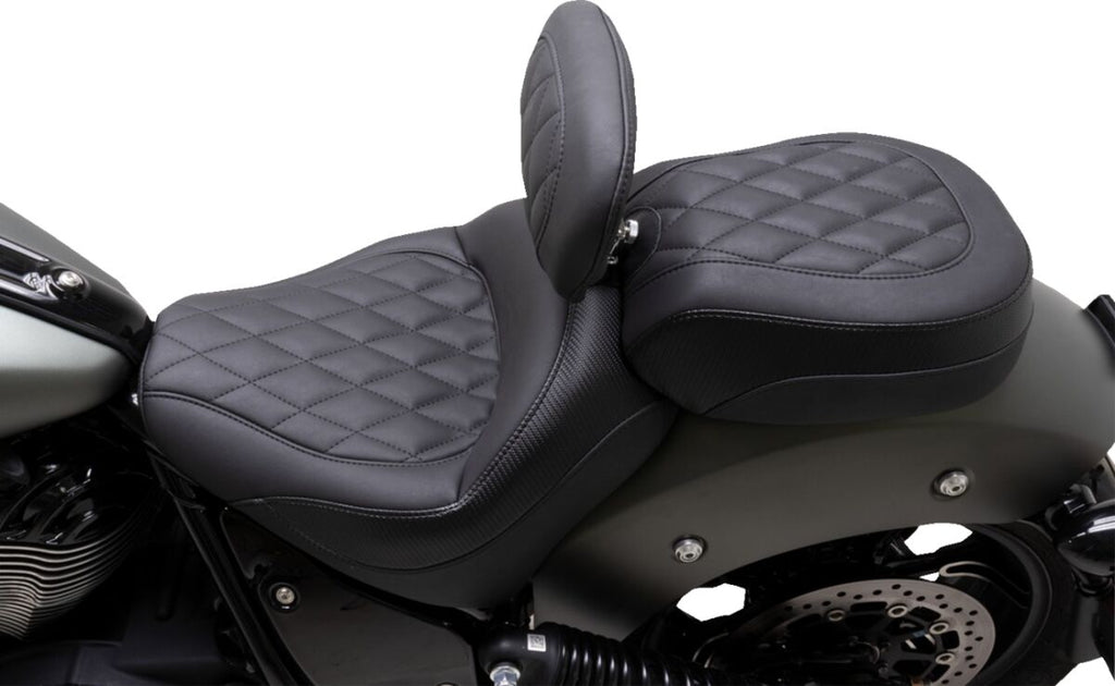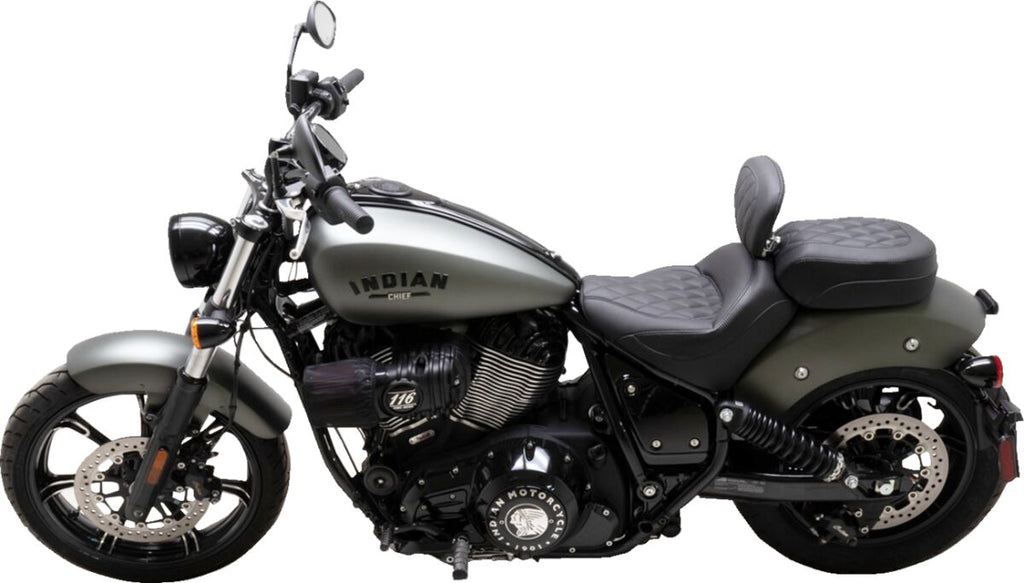 Standard Touring Solo SeatEnhance the comfort of your Indian Chief with the standard touring collection from Mustang The solo seat has a classic look and generous rise with a comfortable 13.5" wide seating area Pair it with a 9.75" wide passenger seat that overlaps the top of the solo for even more driver back support or opt for the solo with integrated backrest Wide bucketed rider area provides excellent support with a classic diamond stitch and carbon-fiber look accents Places rider at a similar reach compared to stock 9.75" wide passenger area allows for comfortable 2-up riding Hand sewn cover with classic single diamond stitching made from marine-grade expanded vinyl Mustang's proprietary controlled-density foam formula requires no break-in and retains shape and support after years of use Marine-grade fiberglass baseplate for long-lasting support and durability, with polyurethane bumpers to absorb vibration Made in the U.S.A. Indian CHIEF 111 ABS 2022-2025 Indian CHIEF 116 ABS 2022-2025 Indian SPORT CHIEF 116 ABS 2024-2025 Indian SUPER CHIEF 111 2024-2025 Indian SUPER CHIEF 111 ABS 2022-2024 Indian SUPER CHIEF 116 2023-2024 Indian SUPER CHIEF 116 ABS 2022-2025