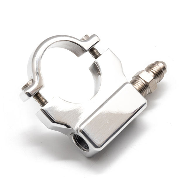Polished mount fits 1.250" BARS, GAUGE WITH 1/8 NPT PORT Includes billet 6061 handlebar clamp, stainless allen head bolts and 1/8 NPT to -3AN adapter fitting. MADE IN USA