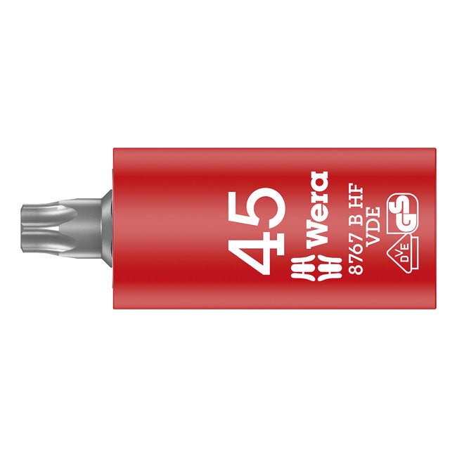The insulated Zyklop VDE socket bit comes with 3/8" drive, are compatible with ball locking ratchets and come with holding function. The dual isolation layer exists of a yellow insulation core under a red insulation outer layer. This will help visual identification of isolation issues. Sockets are individually tested at 10.000 Volts. This is in accordance with IEC 60900, which ensures safe working with live wiring up to 1000 Volts. Bit size: TX45. Socket length: 59mm. Top: 23mm. Bottom: 13mm.