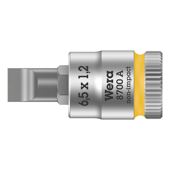 Wera Slotted Socket Bit Zyklop 1/4 Inch 581461 1/4" drive for slotted bolts/screws. Chrome vanadium with a brushed chrome plated finish and color coded for bit style (yellow is slotted). Knurled at the base for easier manual turning. With ball intercept ring. Note: Not compatible with impact wrenches. Tip thickness at tip: 1.2mm. Tip width: 6.5mm. Overall length: 28mm. Slotted bolts/screws