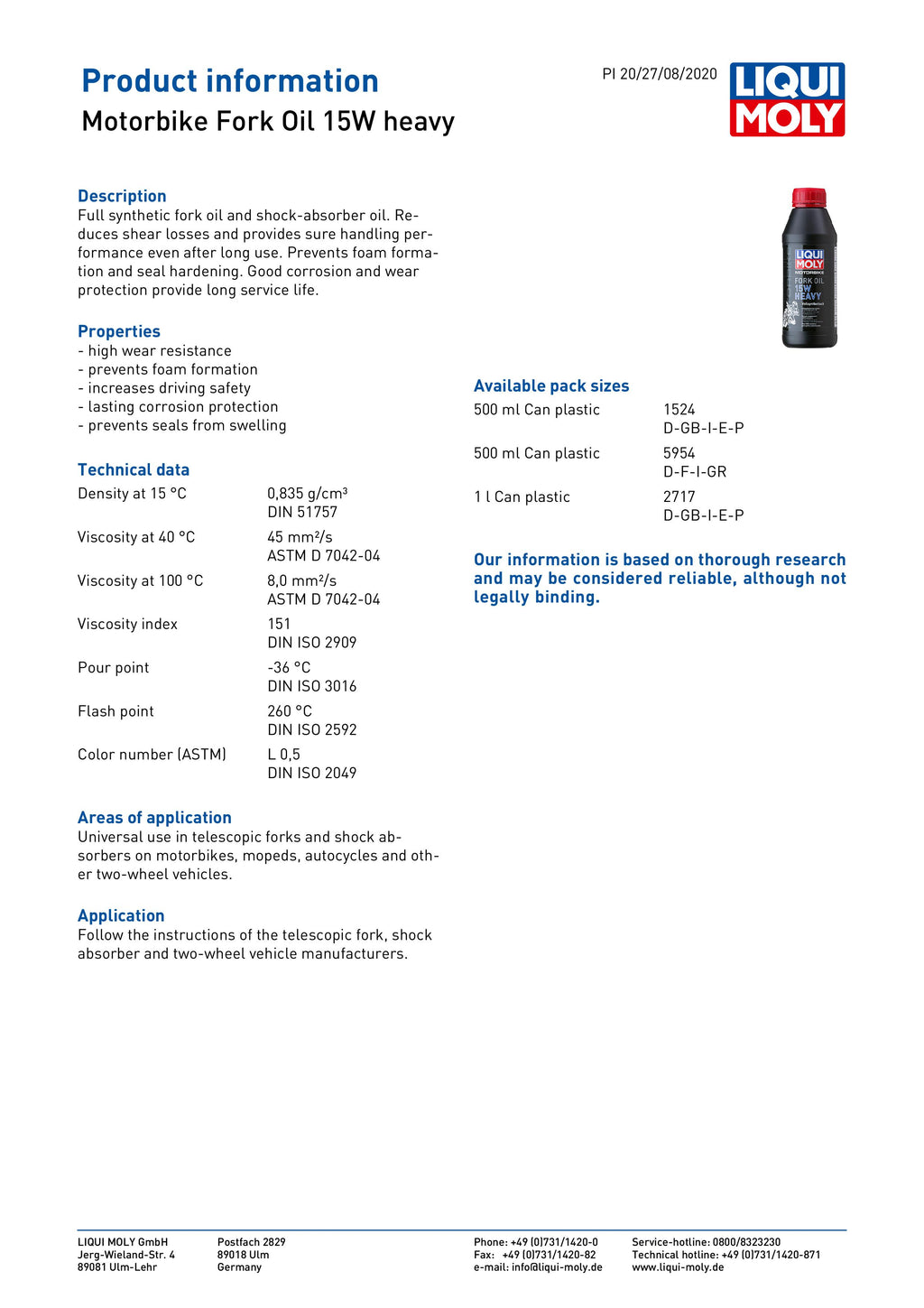 Full synthetic fork oil and shock-absorber oil. Reduces shear losses and provides sure handling performance even after long use. Prevents foam formation and seal hardening. Good corrosion and wear protection provide long service life.