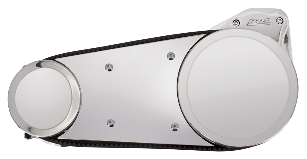 These kits include a 3" wide belt drive unit with a polished pressure plate, double row sealed mainshaft bearing, a polished aluminum side plate and pulley covers and a complete BDL "Competitor Clutch" with Kevlar plates. The kits also include a beefy, one piece polished billet motor plate. The motor plate will lock the transmission and the engine together which is needed when you are eliminating the inner primary for the open belt drive mounting. Kits require the use of a 1990 to present style starter.