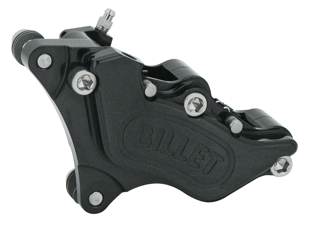 Harrison Engineering was, back in 1986, one of the first companies to design and develop a multi-piston aftermarket caliper for Harley-Davidson motorcycles. Each fully progressive 4 or 6 Piston caliper is precisely CNC machined from lightweight blocks of aircraft quality aluminum alloy. To keep the internal tolerances to a minimum, the caliper pistons are machined from special low expansion aluminum alloy and have a hard anodized finish that has the same anti-wear properties as hardened steel. For maximum performance the calipers have one pad for each piston. Harrison claims this gives a more ‘leading edge bite' on the disc than any two pad, or differential bore calipers. It is also especially beneficial in wet conditions, because the first set of pads sweep water off the disc, while the following 2 or 4 pads are still ‘biting' on the disc. That removes the effect of the calipers ‘skating' on the disc, and then braking sharply and suddenly when the disc becomes dry. They are truly progressive calipers, with a direct and sensitive relation between the amount of lever pressure, and the amount of braking power. These show polished or black anodized calipers not only have ultimate stopping power, they also have the ultimate looks, and are available for almost all models. The front calipers bolt straight to the front fork bottom leg, and the rear sets include the mounting bracket. Stainless steel shims, to space the caliper to the disc, and mounting bolts are included with each kit. The front as well as the rear sets are available in both 4 or 6 piston versions, as well as polished or black anodized. Matching design brake rotors can be found elsewhere in this catalogue. All Harrison Billet calipers are approved, and come with a limited lifetime warranty on piston wear.