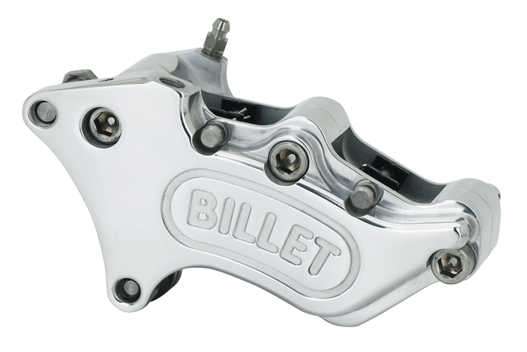Harrison Engineering was, back in 1986, one of the first companies to design and develop a multi-piston aftermarket caliper for Harley-Davidson motorcycles. Each fully progressive 4 or 6 Piston caliper is precisely CNC machined from lightweight blocks of aircraft quality aluminum alloy. To keep the internal tolerances to a minimum, the caliper pistons are machined from special low expansion aluminum alloy and have a hard anodized finish that has the same anti-wear properties as hardened steel. For maximum performance the calipers have one pad for each piston. Harrison claims this gives a more ‘leading edge bite' on the disc than any two pad, or differential bore calipers. It is also especially beneficial in wet conditions, because the first set of pads sweep water off the disc, while the following 2 or 4 pads are still ‘biting' on the disc. That removes the effect of the calipers ‘skating' on the disc, and then braking sharply and suddenly when the disc becomes dry. They are truly progressive calipers, with a direct and sensitive relation between the amount of lever pressure, and the amount of braking power. These show polished or black anodized calipers not only have ultimate stopping power, they also have the ultimate looks, and are available for almost all models. The front calipers bolt straight to the front fork bottom leg, and the rear sets include the mounting bracket. Stainless steel shims, to space the caliper to the disc, and mounting bolts are included with each kit. The front as well as the rear sets are available in both 4 or 6 piston versions, as well as polished or black anodized. Matching design brake rotors can be found elsewhere in this catalogue. All Harrison Billet calipers are approved, and come with a limited lifetime warranty on piston wear.