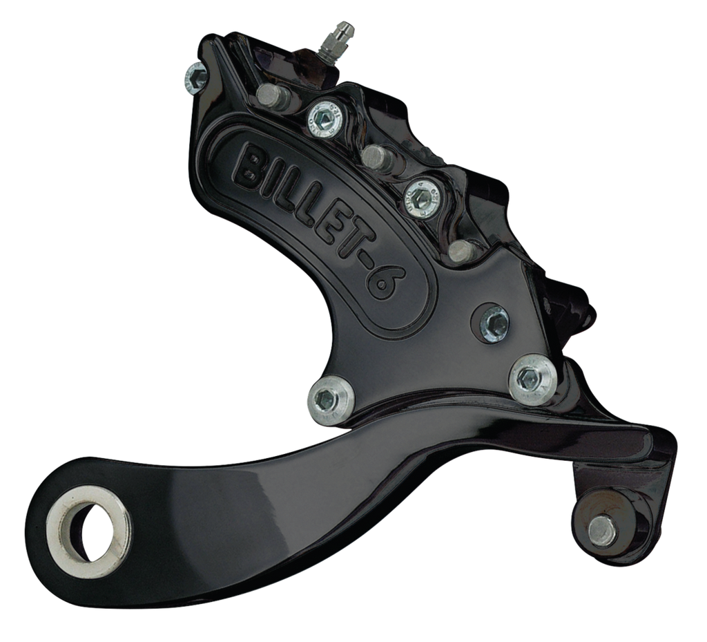 Harrison Engineering was, back in 1986, one of the first companies to design and develop a multi-piston aftermarket caliper for Harley-Davidson motorcycles. Each fully progressive 4 or 6 Piston caliper is precisely CNC machined from lightweight blocks of aircraft quality aluminum alloy. To keep the internal tolerances to a minimum, the caliper pistons are machined from special low expansion aluminum alloy and have a hard anodized finish that has the same anti-wear properties as hardened steel. For maximum performance the calipers have one pad for each piston. Harrison claims this gives a more ‘leading edge bite' on the disc than any two pad, or differential bore calipers. It is also especially beneficial in wet conditions, because the first set of pads sweep water off the disc, while the following 2 or 4 pads are still ‘biting' on the disc. That removes the effect of the calipers ‘skating' on the disc, and then braking sharply and suddenly when the disc becomes dry. They are truly progressive calipers, with a direct and sensitive relation between the amount of lever pressure, and the amount of braking power. These show polished or black anodized calipers not only have ultimate stopping power, they also have the ultimate looks, and are available for almost all models. The front calipers bolt straight to the front fork bottom leg, and the rear sets include the mounting bracket. Stainless steel shims, to space the caliper to the disc, and mounting bolts are included with each kit. The front as well as the rear sets are available in both 4 or 6 piston versions, as well as polished or black anodized. Matching design brake rotors can be found elsewhere in this catalogue. All Harrison Billet calipers are approved, and come with a limited lifetime warranty on piston wear.