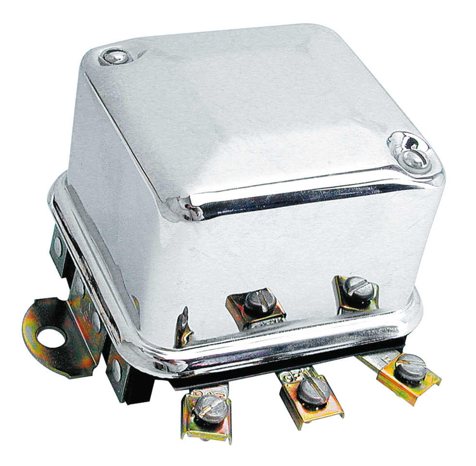 This Accel regulator is set at the factory to exact OEM specifications and feature heavy-duty shock mounted steel bases, vibration resistant internal wire connections, OEM style cover, fiber and mylar insulating pads, and large diameter contact surfaces. Fits 6 Volt K and XL models from 1952 thru 1964 and 1958 thru 1964 Big Twin models (OEM 74510-47A).