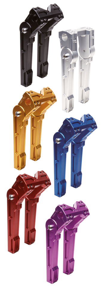 Precision machined billet aluminum 10 inch (25.4cm) high risers with an adjustable head and one-piece top clamp for use with handlebars that are 1" in diameter at the riser mounts. Comes complete with M12-1.5x70mm riser bolts.